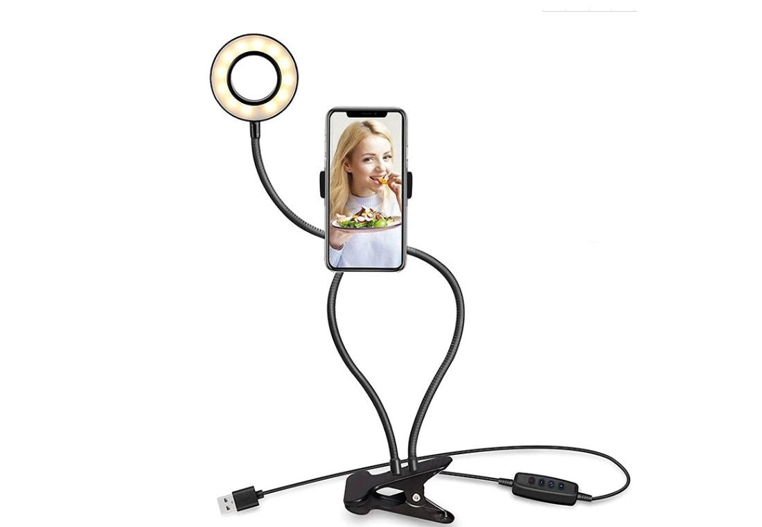 2.ไฟวงแหวนแบบหนีบตั้งโต๊ะสามารถปรับได้ทุกมุมและจะไม่จมลงพร้อมกับโทรศัพท์และมีที่วางโทรศัพท์อีกนิ้วหนึ่งที่วางโทรศัพท์สามารถขยายได้กว้าง 3.5 นิ้วเหมาะสำหรับโทรศัพท์สมาร์ทส่วนใหญ่